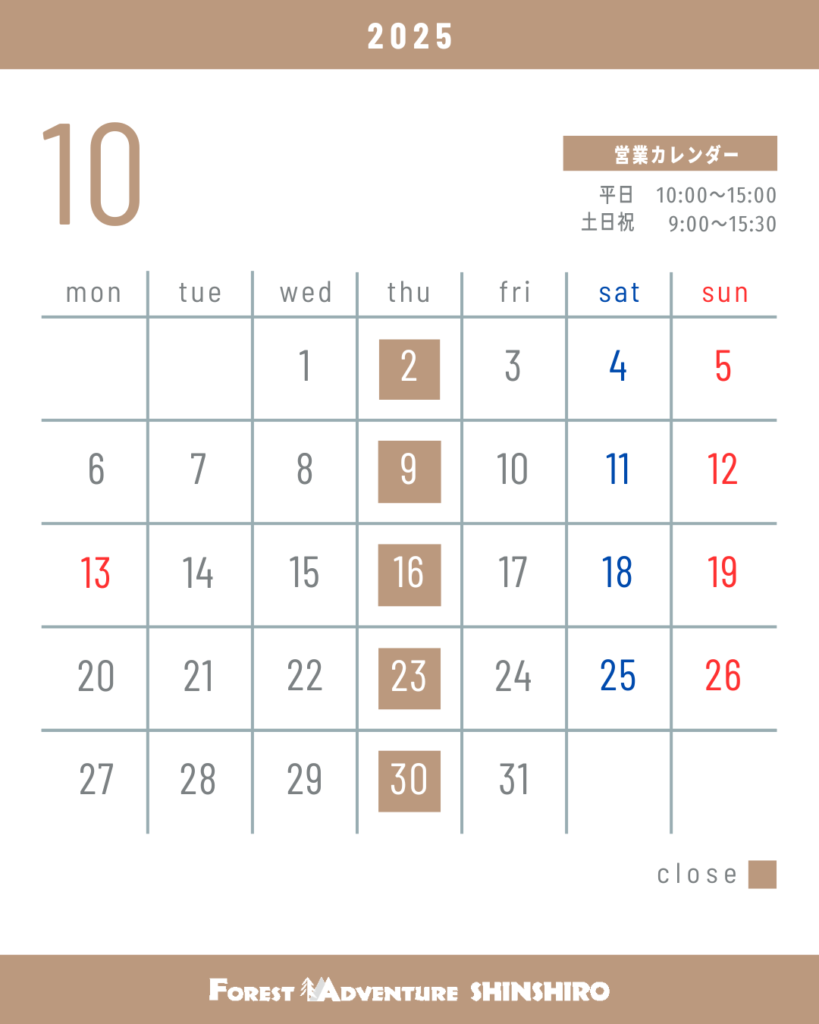 10月も毎週木曜日がクローズとなります。※天候により、急遽クローズする場合がございます。クローズの場合は、HPやSNSにてお知らせいたします。