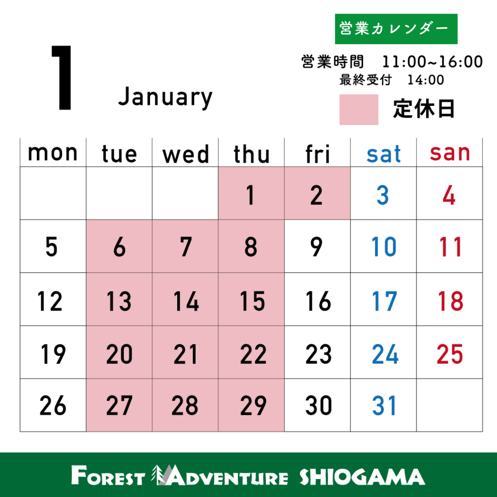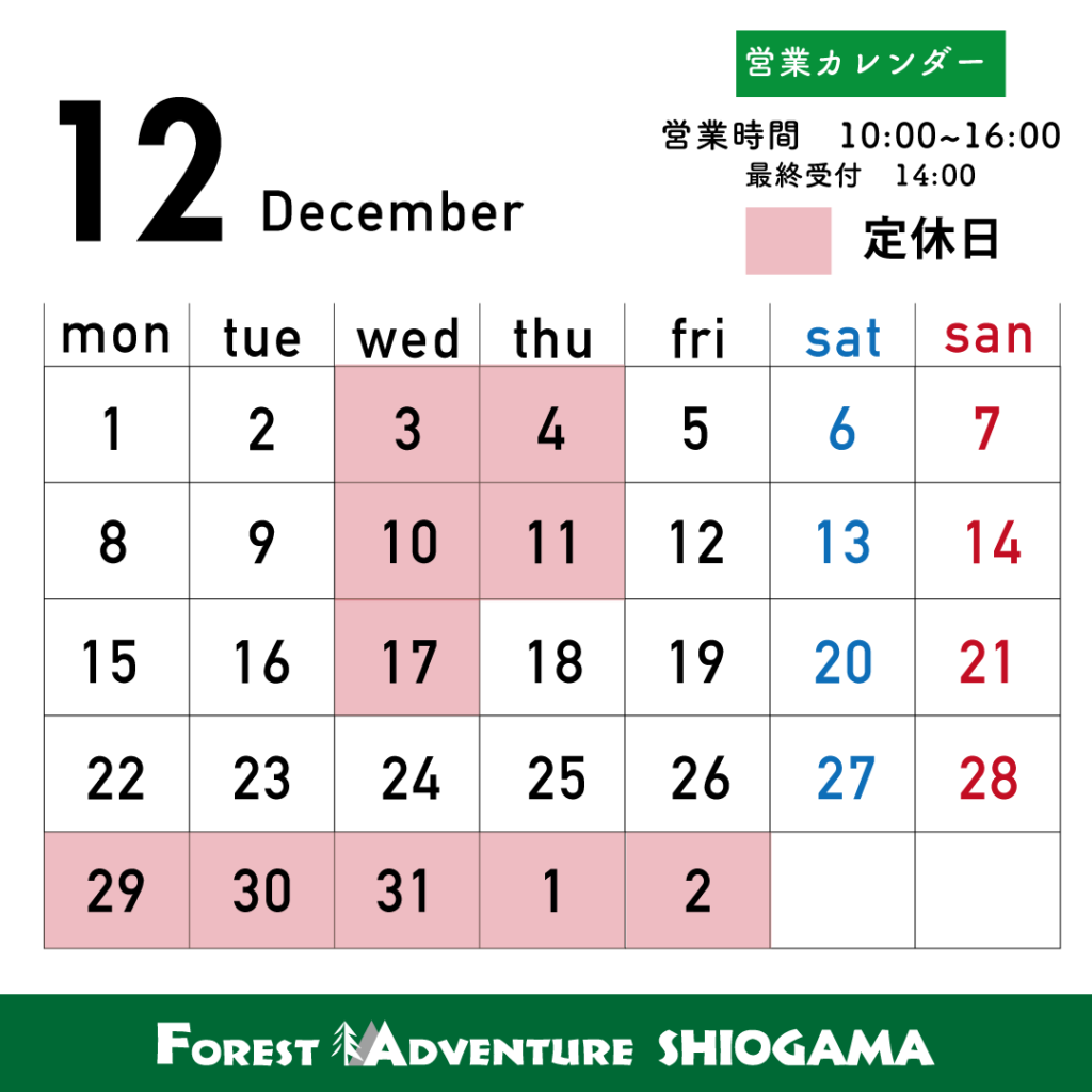 フォレストアドベンチャー・塩竈は積雪・凍結の関係により、12〜2月までが冬季営業となります。