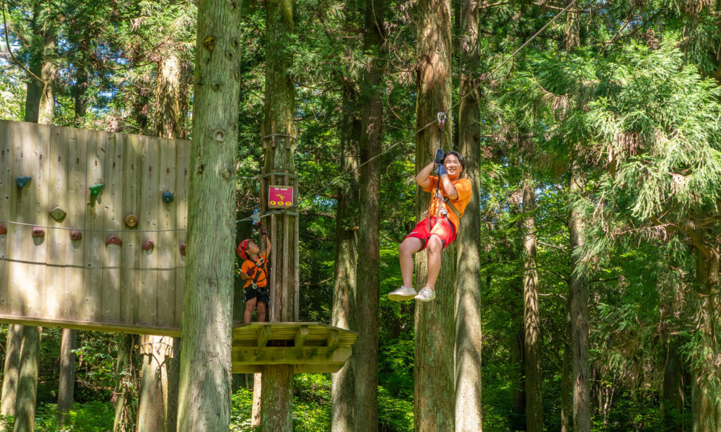 コースで互いに声を掛け合い、ジップスライド(ジップライン)で風を切る。