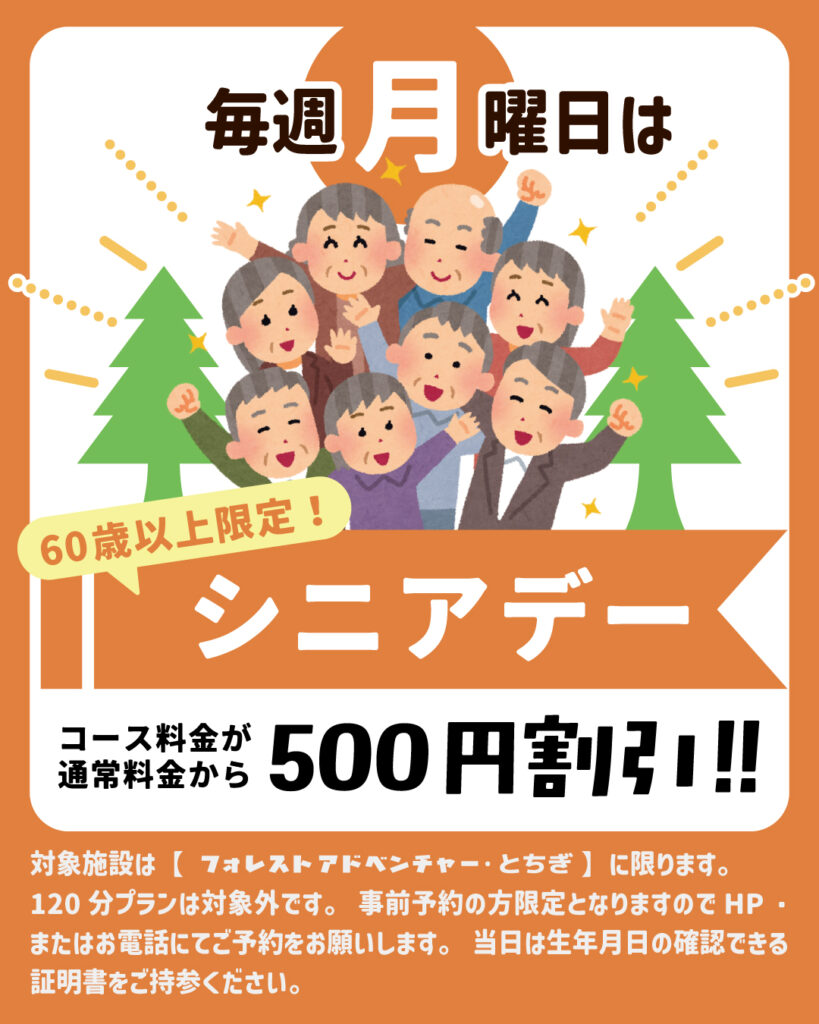 この度、毎週月曜日を「シニアデー」といたしました。自然の中で体を動かし楽しんでいただければと思います。ご家族やお友達、お孫さんと一緒になど・・・皆様のご来場お待ちしております!