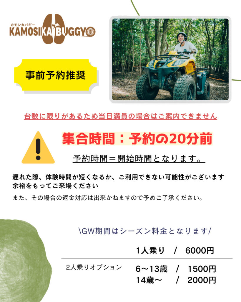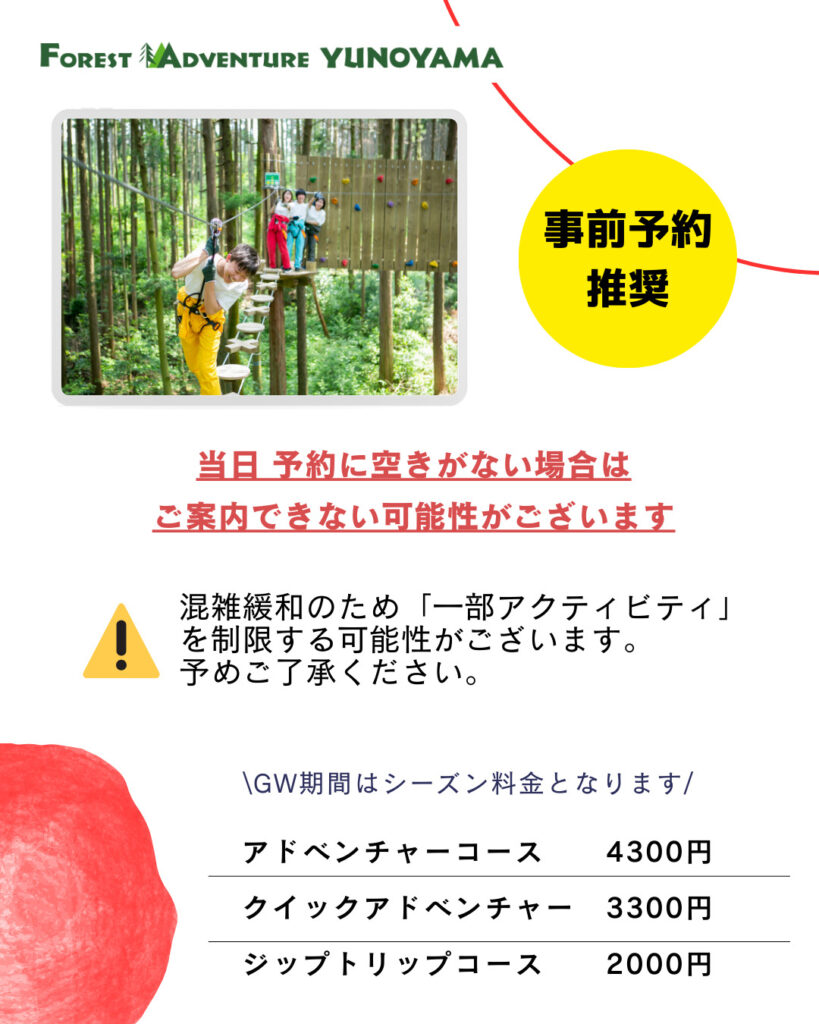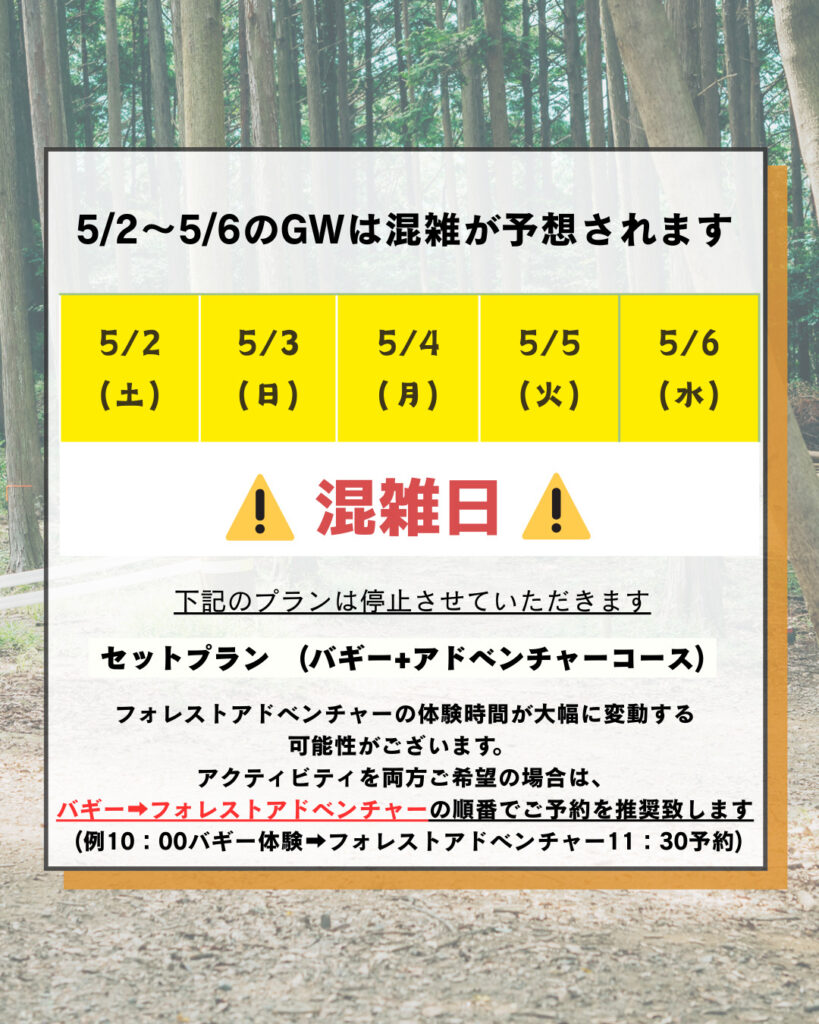 5月2日(土)〜5月6日(水•祝)の GW期間中大変混雑が予想されますので、 あらかじめご確認いただき、ご理解とご協力の程よろしくお願いいたします。 ◇フォレストアドベンチャー・湯の山◇ 【事前予約優先】 ・各回に上限人数があるため、 ご予約がない方は当日の案内ができない可能性がございます。 ⚠️【混雑緩和】のため【一部アクティビティ】を制限する可能性がございます。 ◇カモシカバギー◇ 【事前予約推奨】 ・集合時間は予約の20分前となります。 ・台数に限りがあるため、当日満員の場合はご案内できません。 ・予約時間=開始時間となりますので余裕をもってお越しください ⚠️遅れた際、体験時間が短くなるか、ご利用できない可能性がございます。 また、その場合の返金対応は出来かねますので予めご了承ください。 ◇シーズン料金◇ 期間中下記の料金となります。ご了承ください。 アドベンチャーコース :4300円 クイックアドベンチャー :3300円 ジップトリップコース :2000円 カモシカバギー :6000円 2人乗りオプション(6歳~13歳):1500円 (14歳~ ):2000円 ※【セットプラン(バギー+アドベンチャーコース)】はプランを停止させていただきます。 ◇アクティビティを両方ご希望の場合◇ フォレストアドベンチャーの体験時間が大幅に変動する可能性がございます。 バギー➡フォレストアドベンチャーの順番でご予約を推奨致します。 その際間隔をあけてご予約をお願い致します。 (例10:00バギー体験➡フォレストアドベンチャー11:30予約) ご不明な点がございましたら、アドベンチャーパーク オドルの森へお気軽に問い合わせください。 mail :odor@mori-kaori.jp TEL :059-340-7739