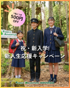 フォレストアドベンチャー・広島では、新たなスタートを切る新入生の皆さまを応援すべく、期間限定の「新入生応援キャンペーン」を開催いたします。