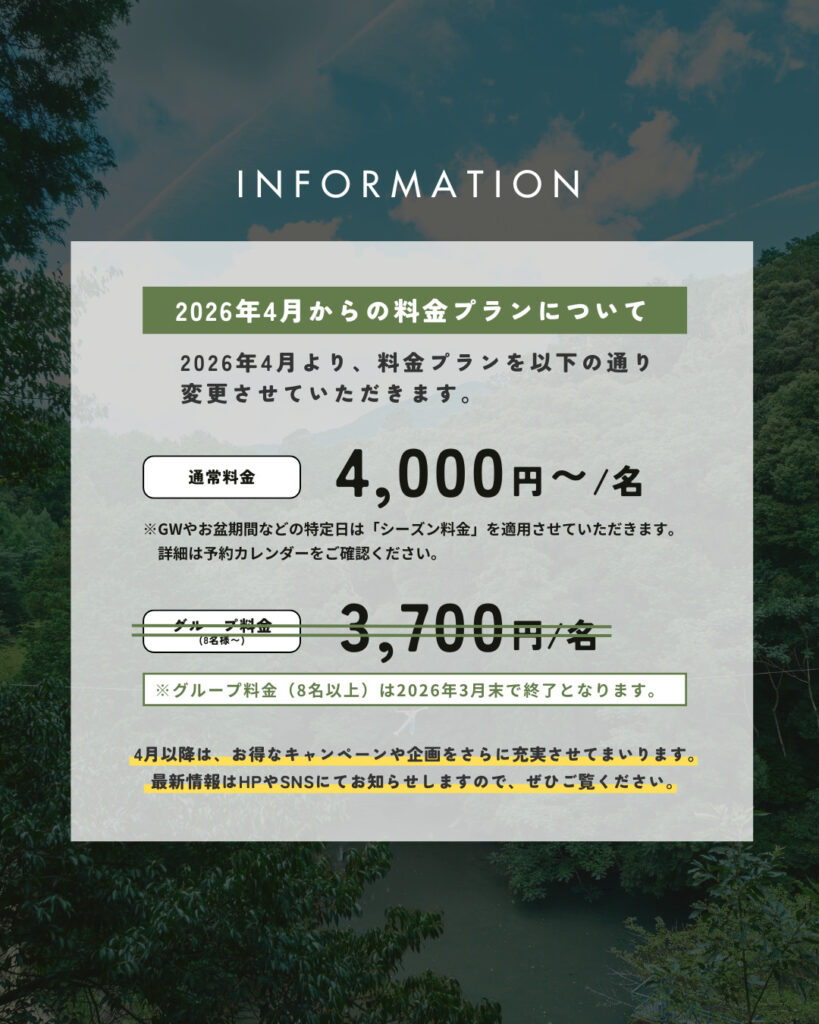 [通常料金]4,000円〜/名※[グループ料金]3,700円/名(8名以上)は2026年3月末で終了となります。※GWやお盆等の特定日は「シーズン料金」となります。予約カレンダーをご確認ください。