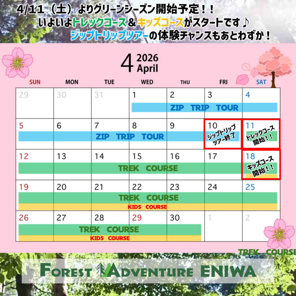 隣接のトレイルアドベンチャーは4/25(土)からを予定しています。
