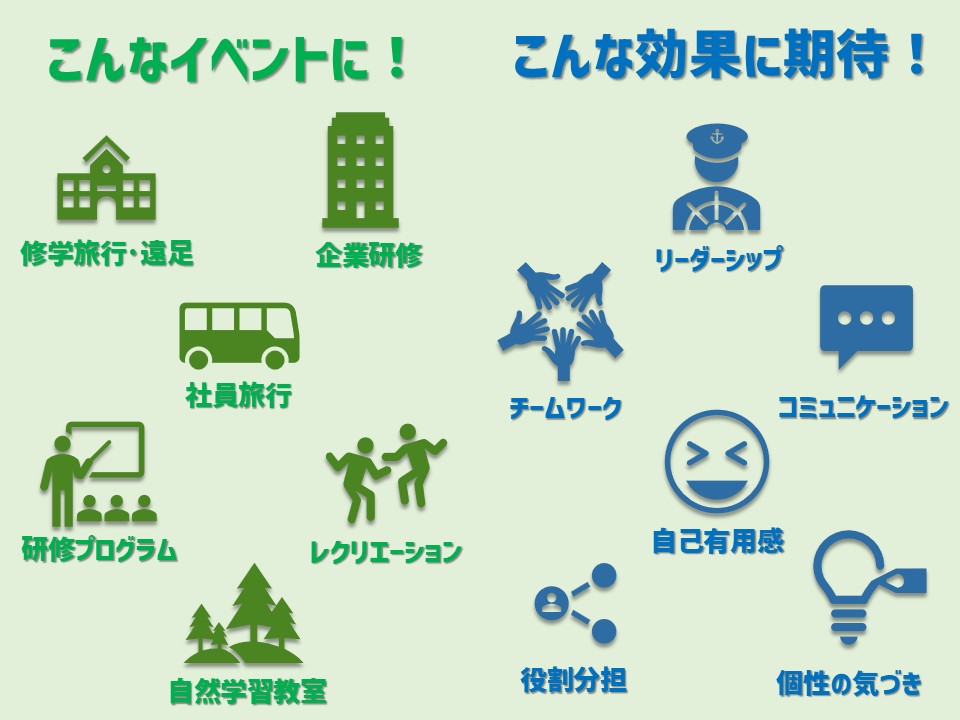安全でありながら体験したことのない 環境のもと「遊び」「学び」「楽しむ」ことができます。校外学習や遠足、修学旅行でのご利用や企業研修やレクリエーションとしてご検討いただいている方は、 是非ご利用ください。