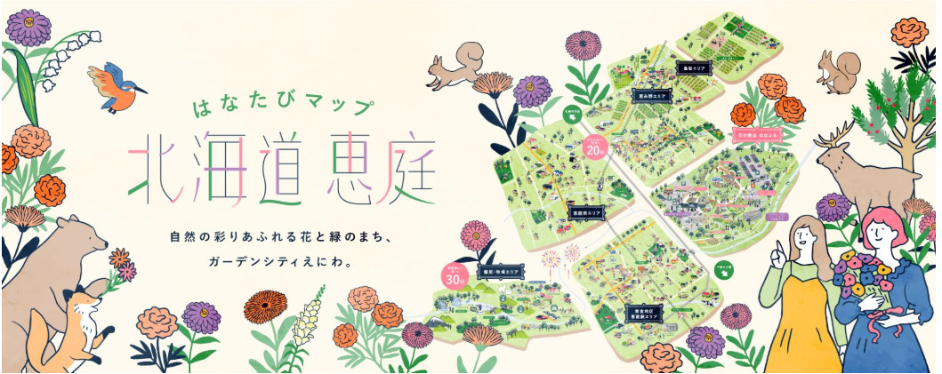 恵庭市花と緑・観光課による恵庭市全域の観光スポットや飲食店を可愛らしいイラストにしたイラストデジタルマップです。沢山の魅力がたっぷりの恵庭市へ、是非足を運んでみてください。はなたびマップはこちらから