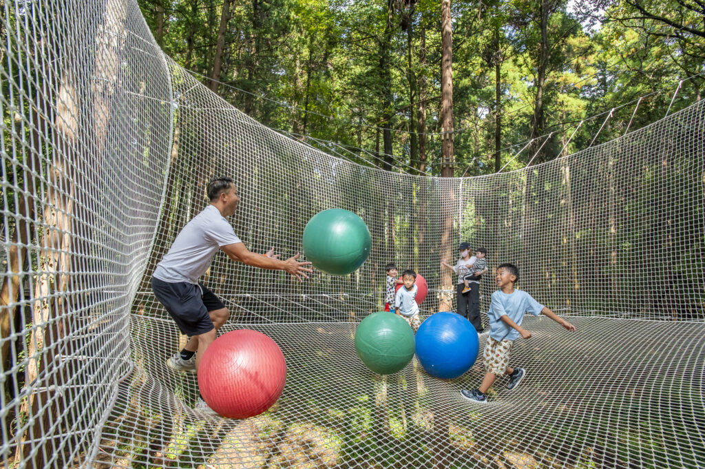 コース内には吊り橋や丸太の上を渡るアクティビティ、寝転んだりボールで遊んだり、