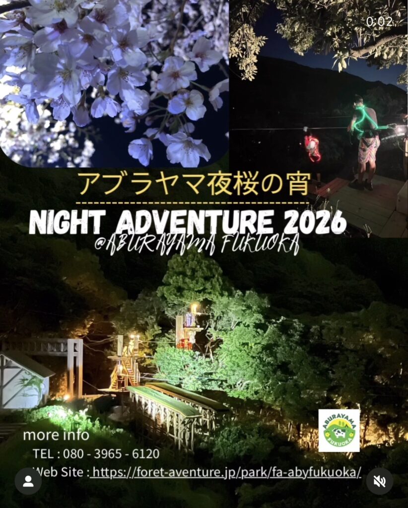 夜の森にやさしく灯る桜と、眼下に広がる福岡の夜景🌸ここでしか味わえない、幻想的なひとときを体験しませんか❓発光アイテムを装着して、ジップトリップコースを周る特別なナイトイベントです。油山福岡では同時開催で4/5まで学生対象のチェキイベントを開催中です!ぜひこの時期だけのイベントをお楽しみください!