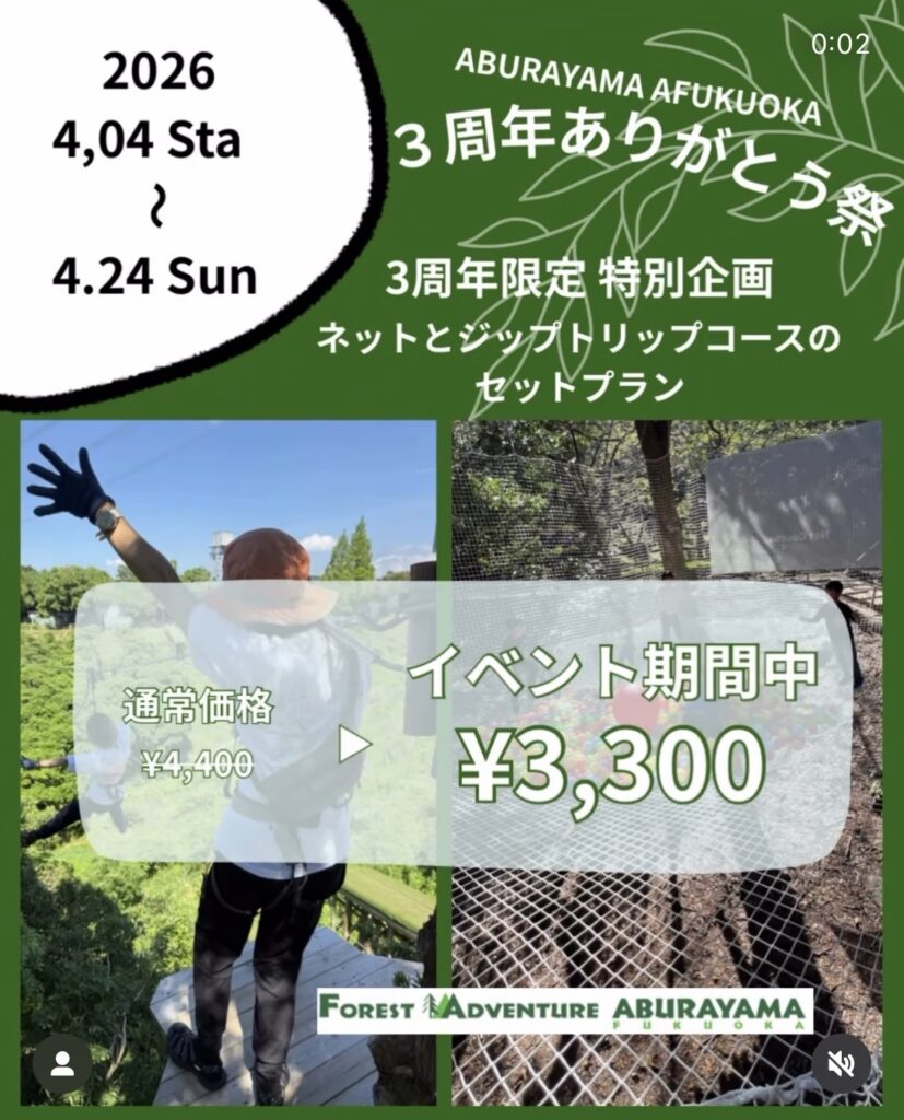 油山福岡のある「ABURAYAMA FUKUOKA」がおかげさまで3周年を迎えました!感謝の気持ちをこめた「3周年限定プラン」が登場!ジップトリップコースとネットコースがセットで楽しめてなんと今だけ3,300円で遊べちゃいます🙌ジップスライドの爽快感とネットコースのトランポリンのようなふわふわ感を同時に味わえるのは今だけ!ぜひ遊びにいらしてください☺️